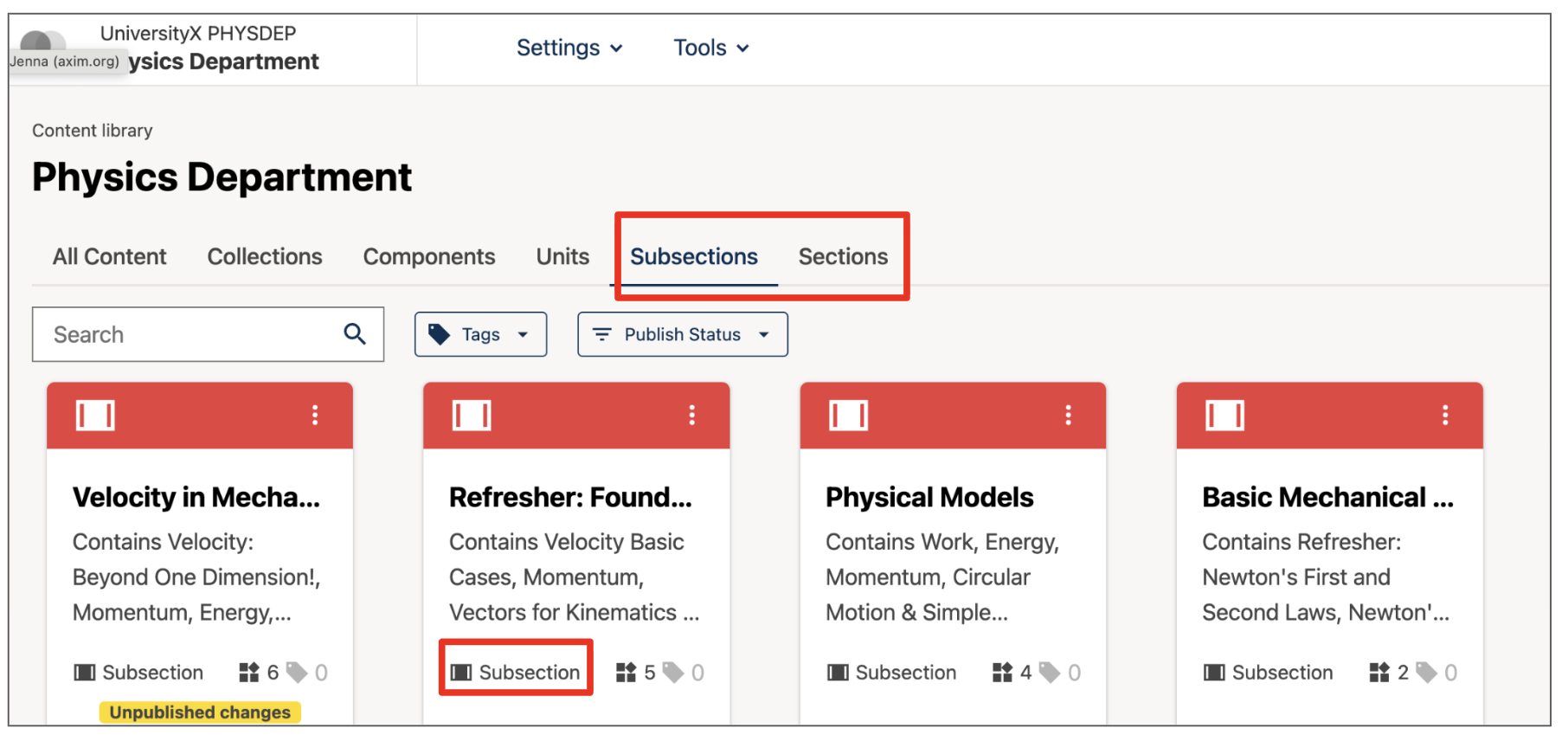 Newly created content or edits can be published via the new publish flow. Publishes to structural blocks will publish all contained content. For example, this means publishing a subsection will also publish all the units and content blocks contained within that subsection.