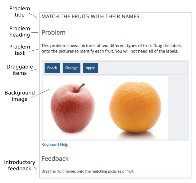 A drag and drop problem includes a background image and one or more items that learners can drag into target zones on the background image. You can include as many draggable items and as many target zones as you need. You can include decoy items that do not have a target, and you can include decoy targets that do not correspond to draggable items.
