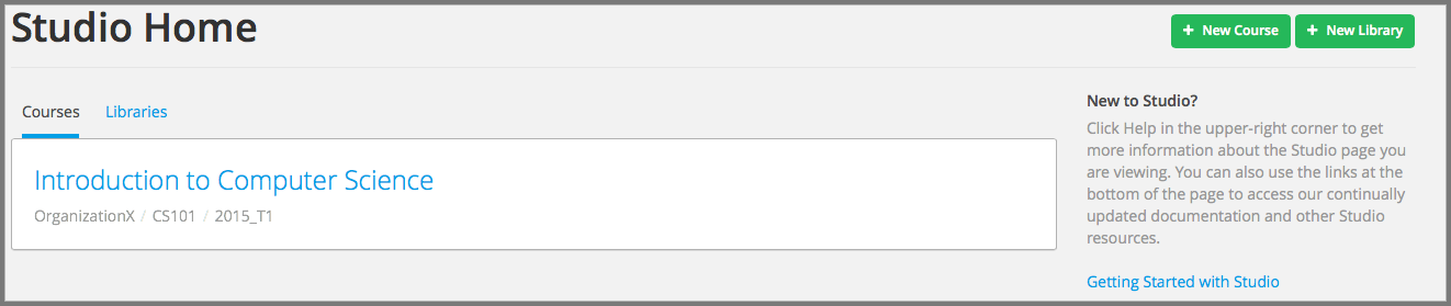 When you return to Studio later, your My Courses dashboard page lists the courses that you created as well as any courses for which you have course team privileges.