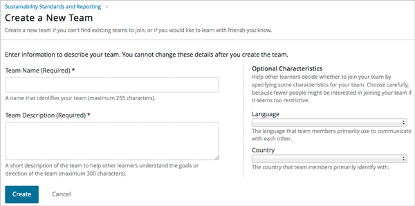 (Optional) Include some optional details for your team. You can specify a language that members would primarily use to communicate with each other, and a country that members would primarily identify with. Keep in mind that if your team details make the team membership seem too selective, other learners might be discouraged from joining.