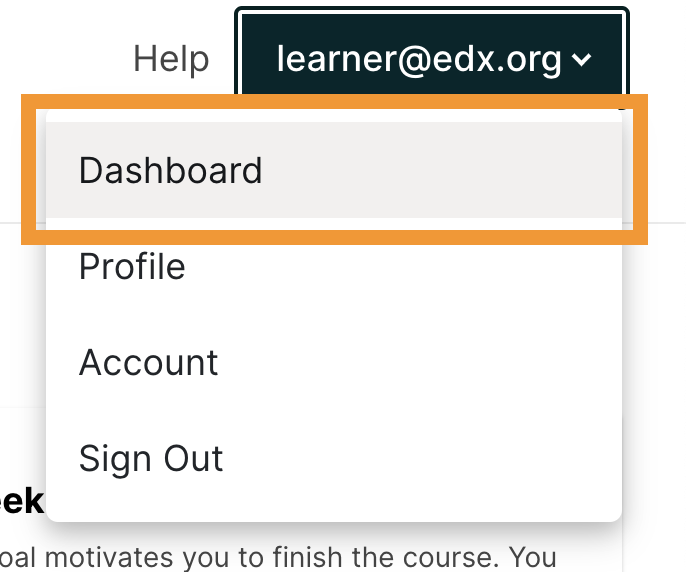 Your dashboard lists all of the courses that you are enrolled in. When you create an account or enroll in a course, you automatically go to your dashboard. You can also access your dashboard by selecting the dropdown menu icon next to your username at the top of any page.