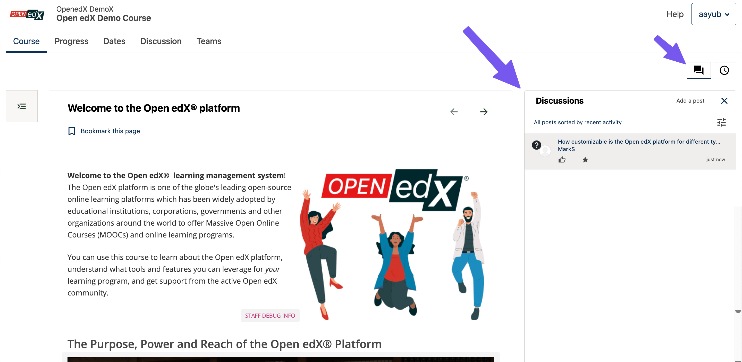 Click on the highlighted button on the top right to open the discussions panel.#